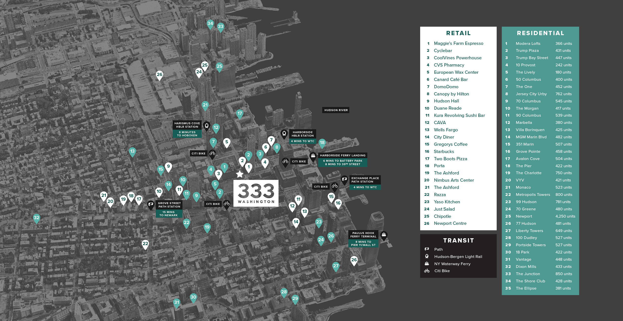 Access to Exchange Place, Newport, and Grove Street PATH stations, plus Hudson Bergen Light Rail stops